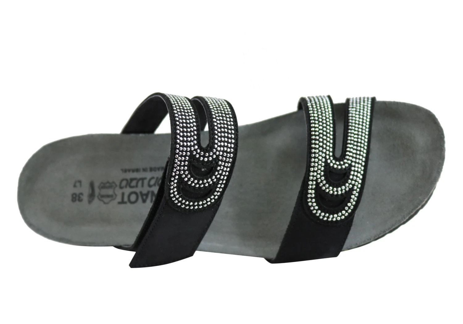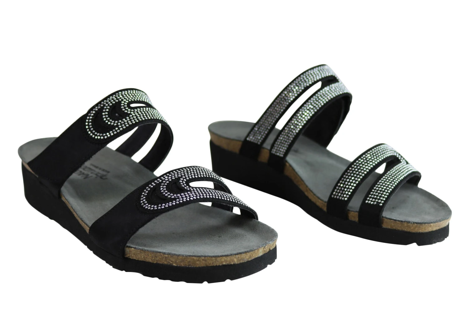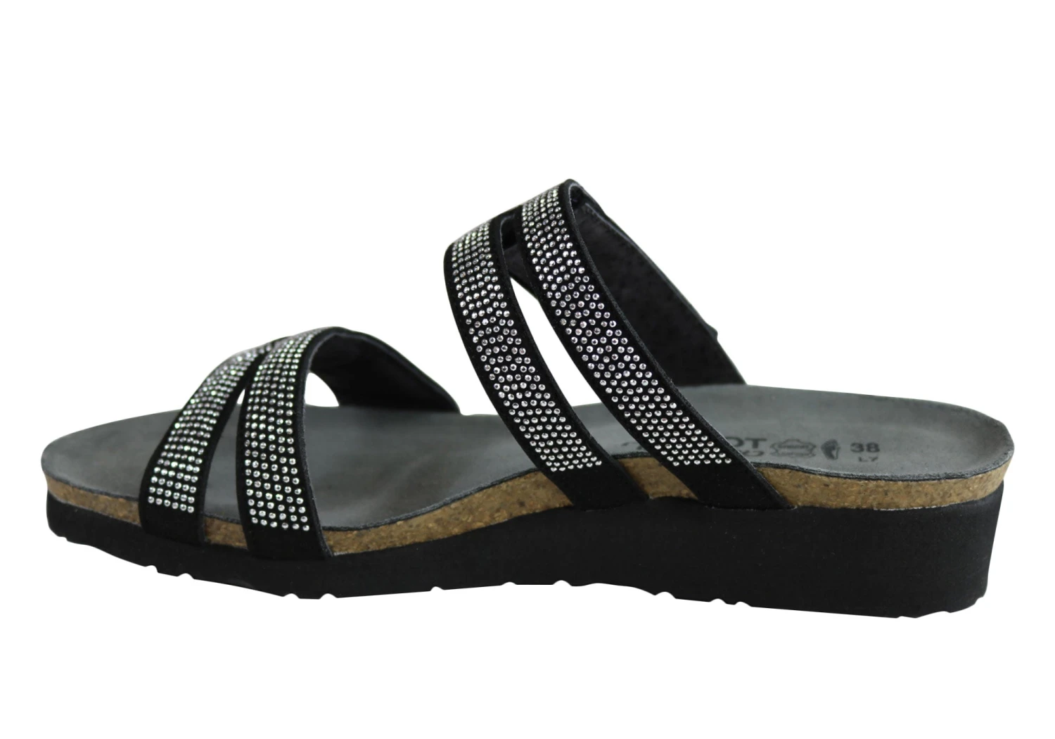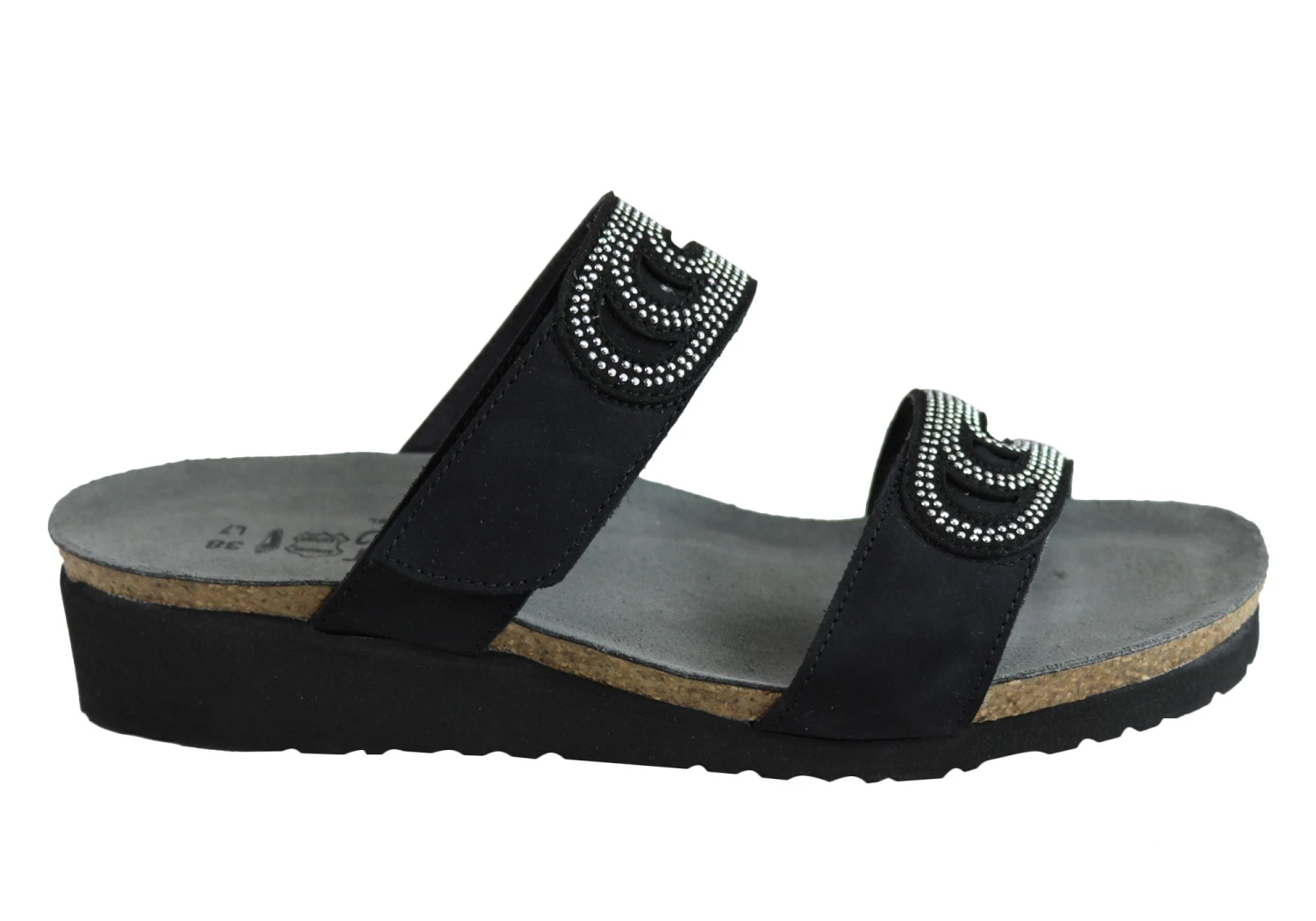 Ainsley by Naot is a stylish slide on the Elegant collection featuring elegant rivet accents and cutout designs, with a hook and loop strap at the instep for adjustability. This style also features Naot’s iconic and superior anatomically-correct cork and latex innersole which is wrapped in soft suede which moulds to the foot with wear. The Naot women’s Elegant collection features a 3.81cm light weight EVA sole for added shock absorption and durability.