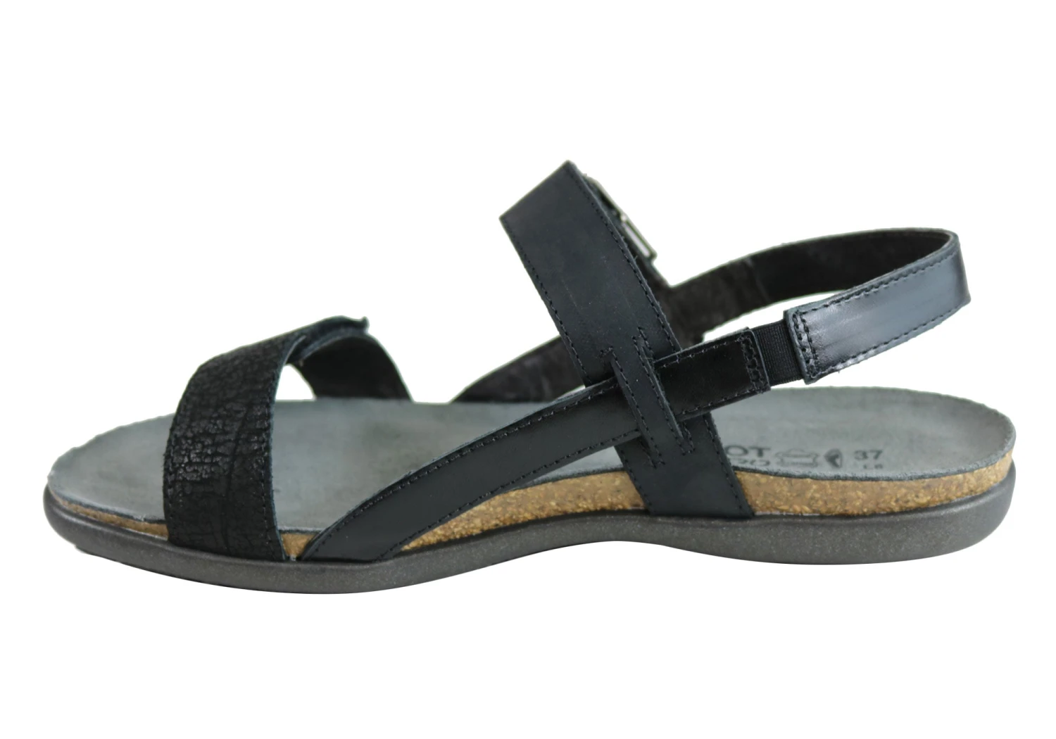 Norah by Naot is a comfortable fashion sandal with faux buckle detailing on the Naot Flat Elegant collection. It features two-strap adjustability with additional gore at the back strap for increased comfort and fit. This style also features Naot’s iconic and superior anatomically-correct cork and latex innersole which is wrapped in soft suede which moulds to the foot with wear. The Naot women’s Flat Elegant collection features a 1.90cm light weight rubber sole for added shock absorption and durability.
